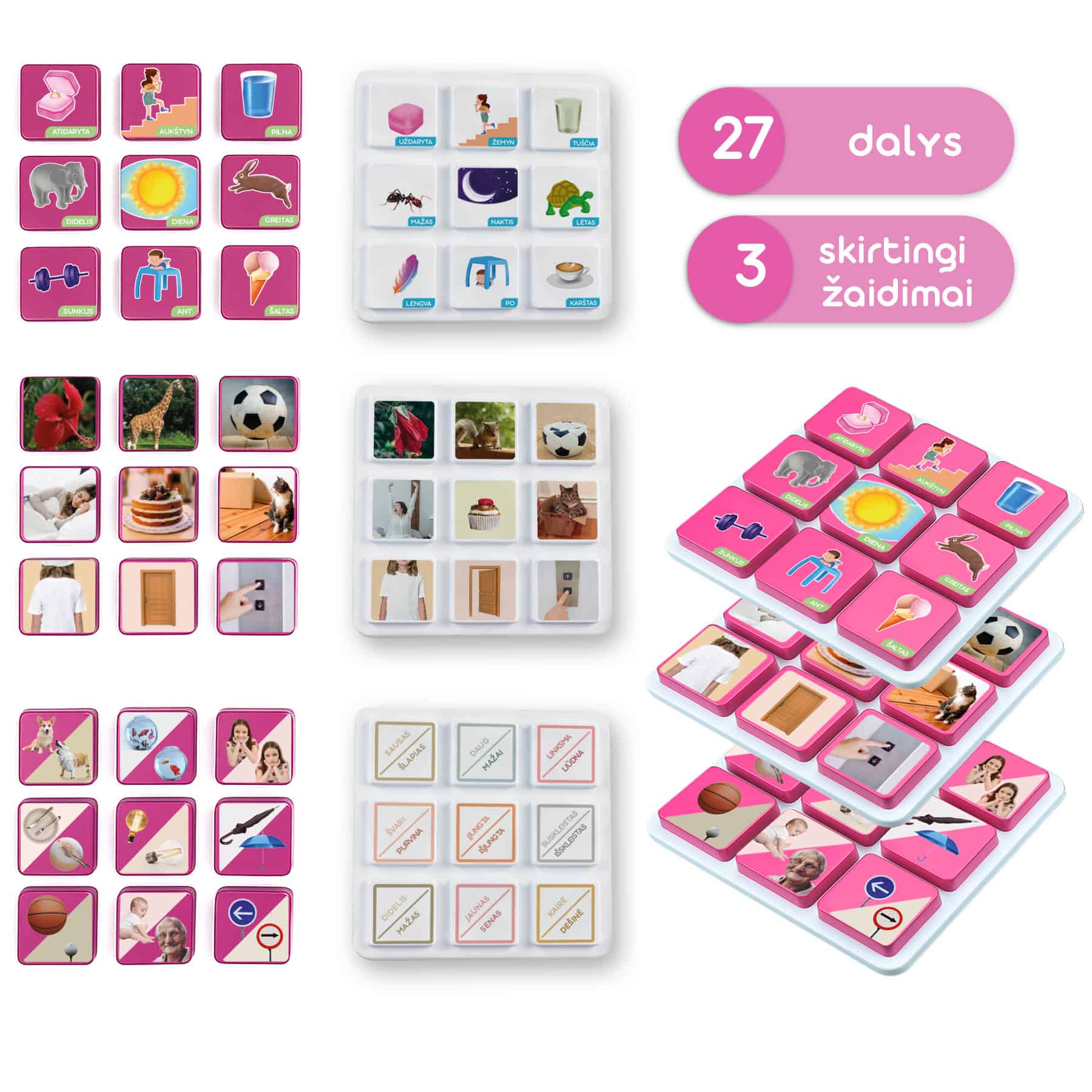 Rinkinys sudarytas iš tvirtų, lengvai paimamų kortelių, ant kurių realiais vaizdais ar simbolinėmis iliustracijomis pavaizduoti priešingi dalykai, pvz.: