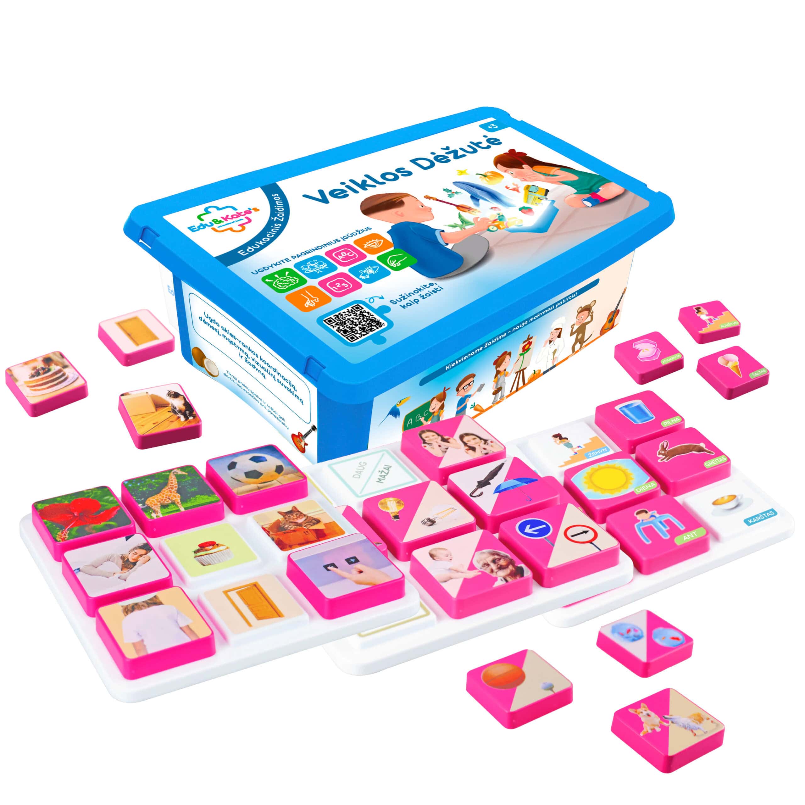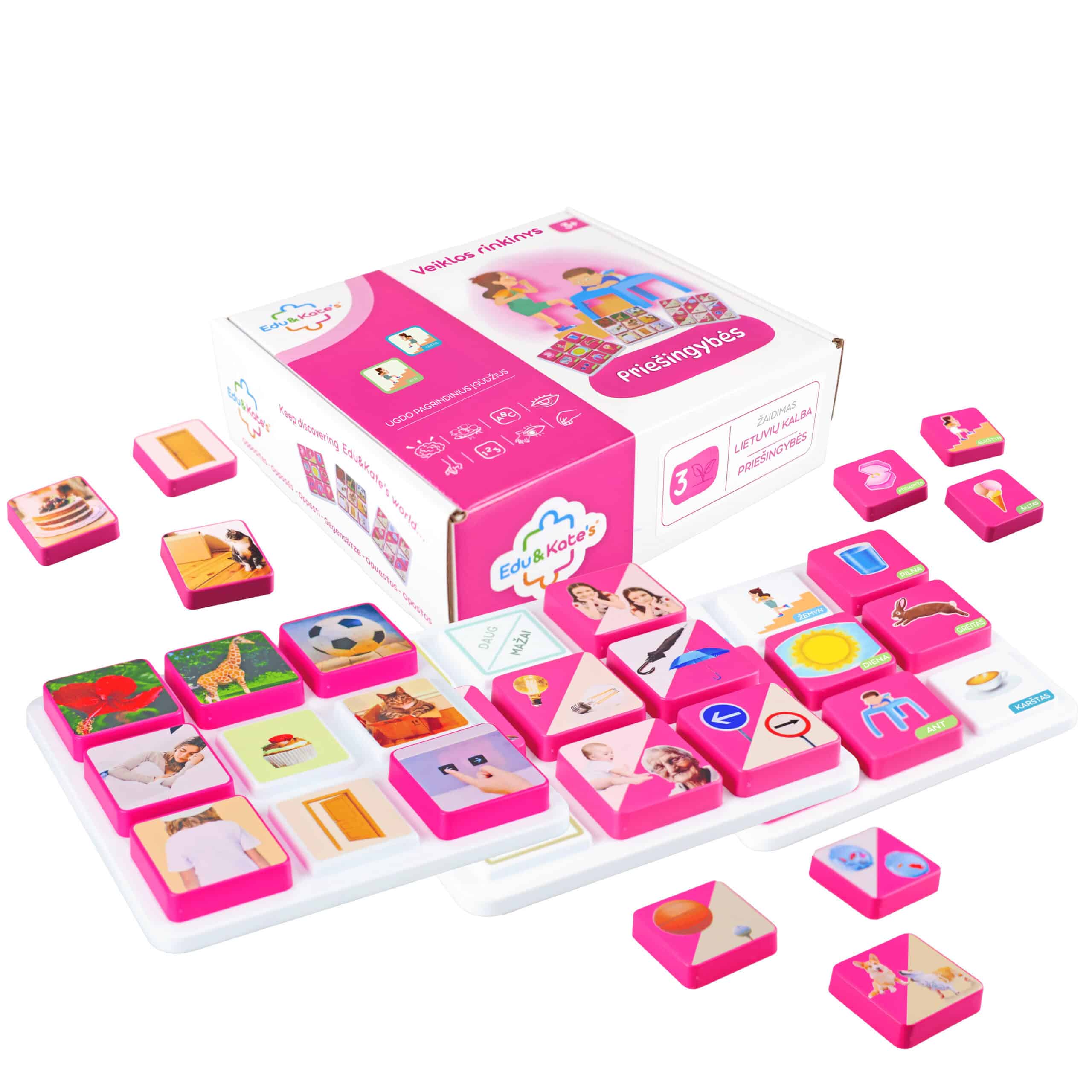 Edu&Kate’s veiklos rinkinys „Priešingybės“ – tai edukacinis žaidimas, padedantis vaikams suprasti svarbiausius priešingų sąvokų principus. Rinkinyje yra trys žaidimų lentos su tikromis nuotraukomis ir iliustracijomis, kurios padeda lengvai įsisavinti tokius priešingumus kaip aukštas/žemas, didelis/mažas, karštas/šaltas ir kt. Šis žaidimas skatina loginį mąstymą, pasaulio suvokimą bei kalbos plėtrą, skatindamas vaiką klasifikuoti ir tvarkyti informaciją. Interaktyvios veiklos su vaizdinėmis ir lytėjimo priemonėmis leidžia vaikams mokytis žaismingai ir prasmingai.