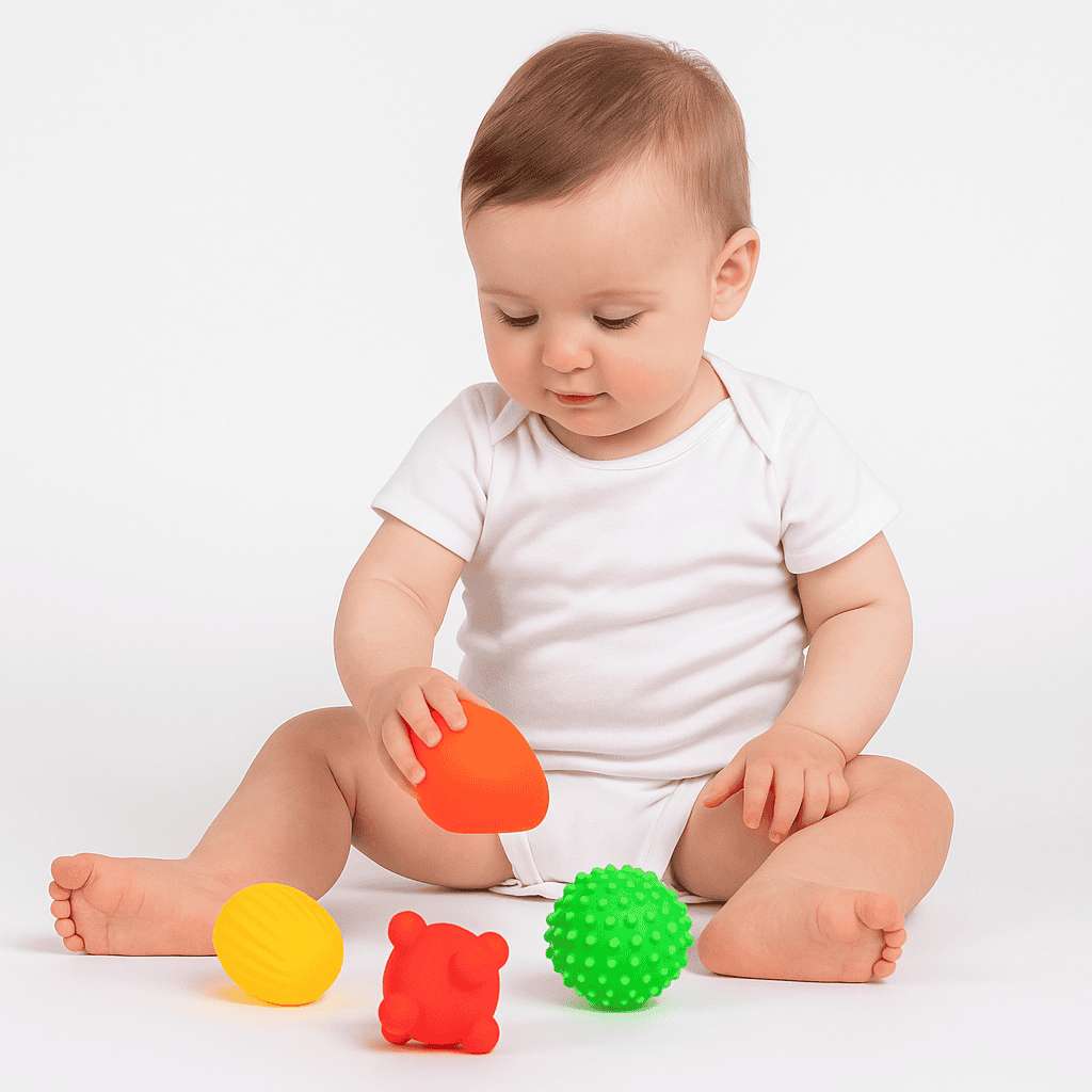 Ryškūs, skirtingų formų ir tekstūrų kamuoliukai skirti lytėjimo, regos ir motorikos lavinimui. Minkšti, lengvai spaudžiami, saugūs kūdikiams nuo 0 mėn. Puikiai tinka masažui, žaidimui ar sensorinei stimuliacijai. Pagaminti iš netoksiškos medžiagos, be BPA.