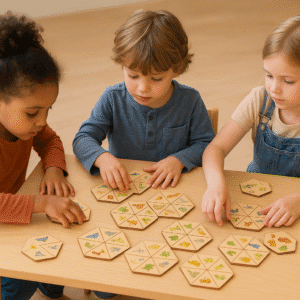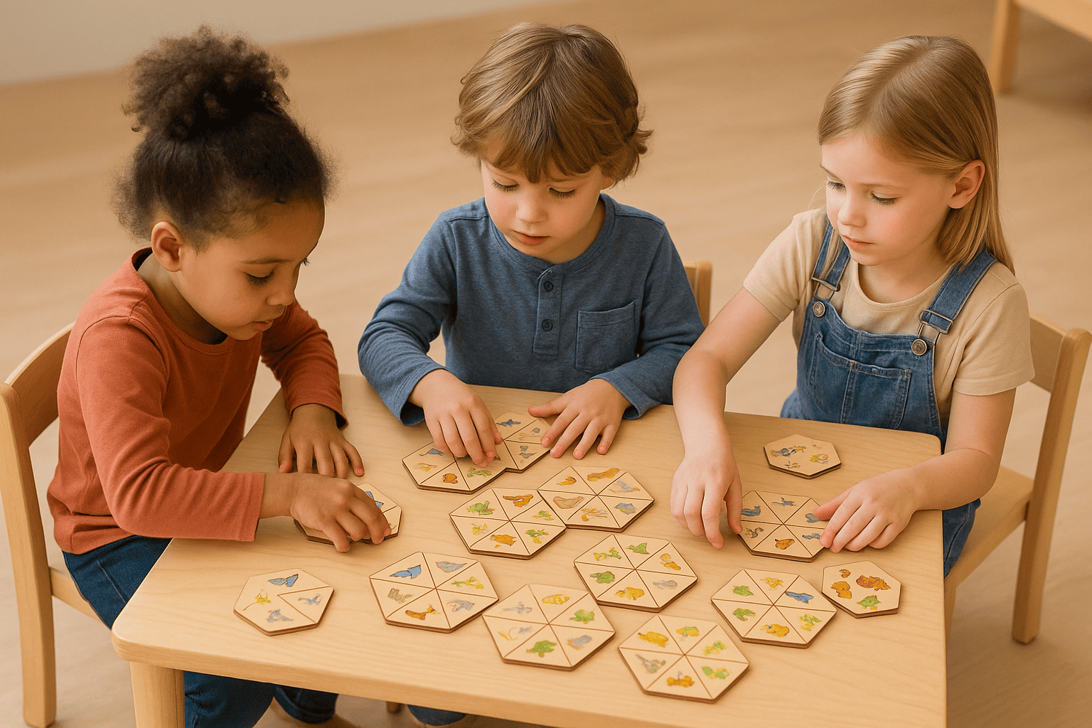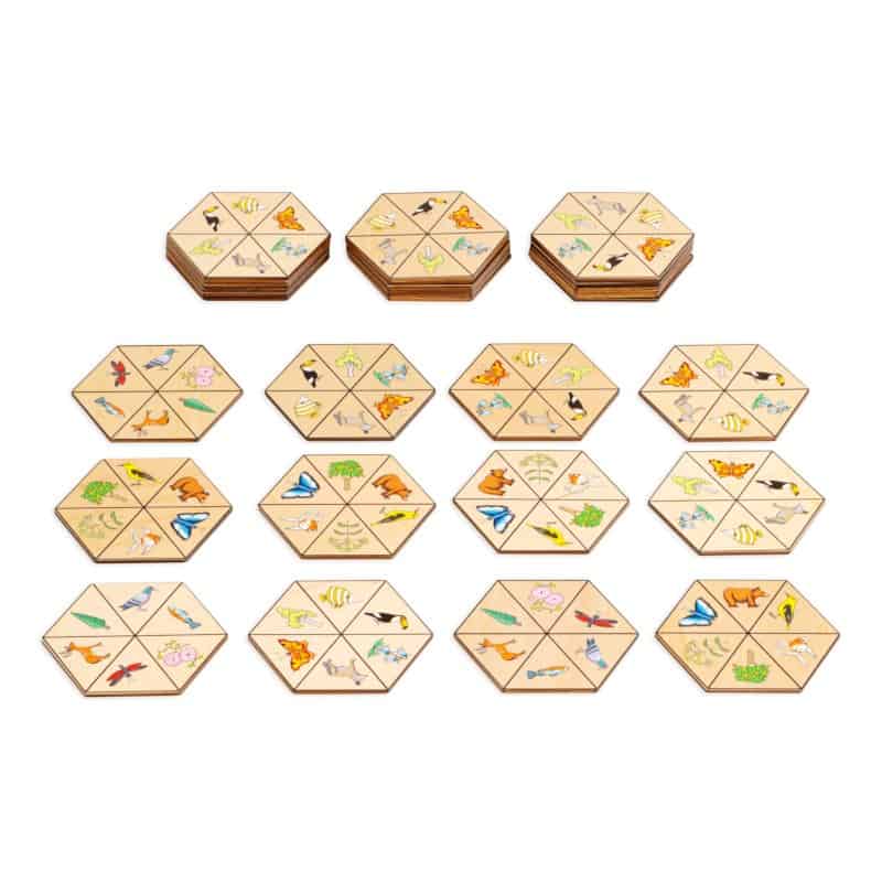 Tai stalo žaidimas, sudarytas iš medinių šešiakampių kortelių, padalytų į 6 dalis, kiekvienoje jų – aiškus, spalvingas piešinys (gyvūnai, augalai, objektai). Vaikai kviečiami sudėlioti korteles pagal bendrus požymius ar temas: pvz., džiunglių gyvūnai, jūros gyvūnai, paukščiai, vabzdžiai, augalai ir kt.